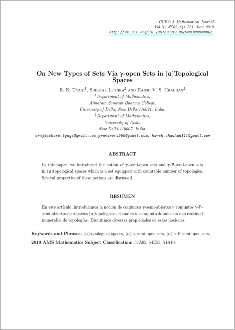 - B. K. Tyagi, Harsh V. S. Chauhan, On generalized closed sets in generalized topological spaces , CUBO, A Mathematical Journal: Vol. 18 No. 1 (2016): CUBO, A Mathematical Journal